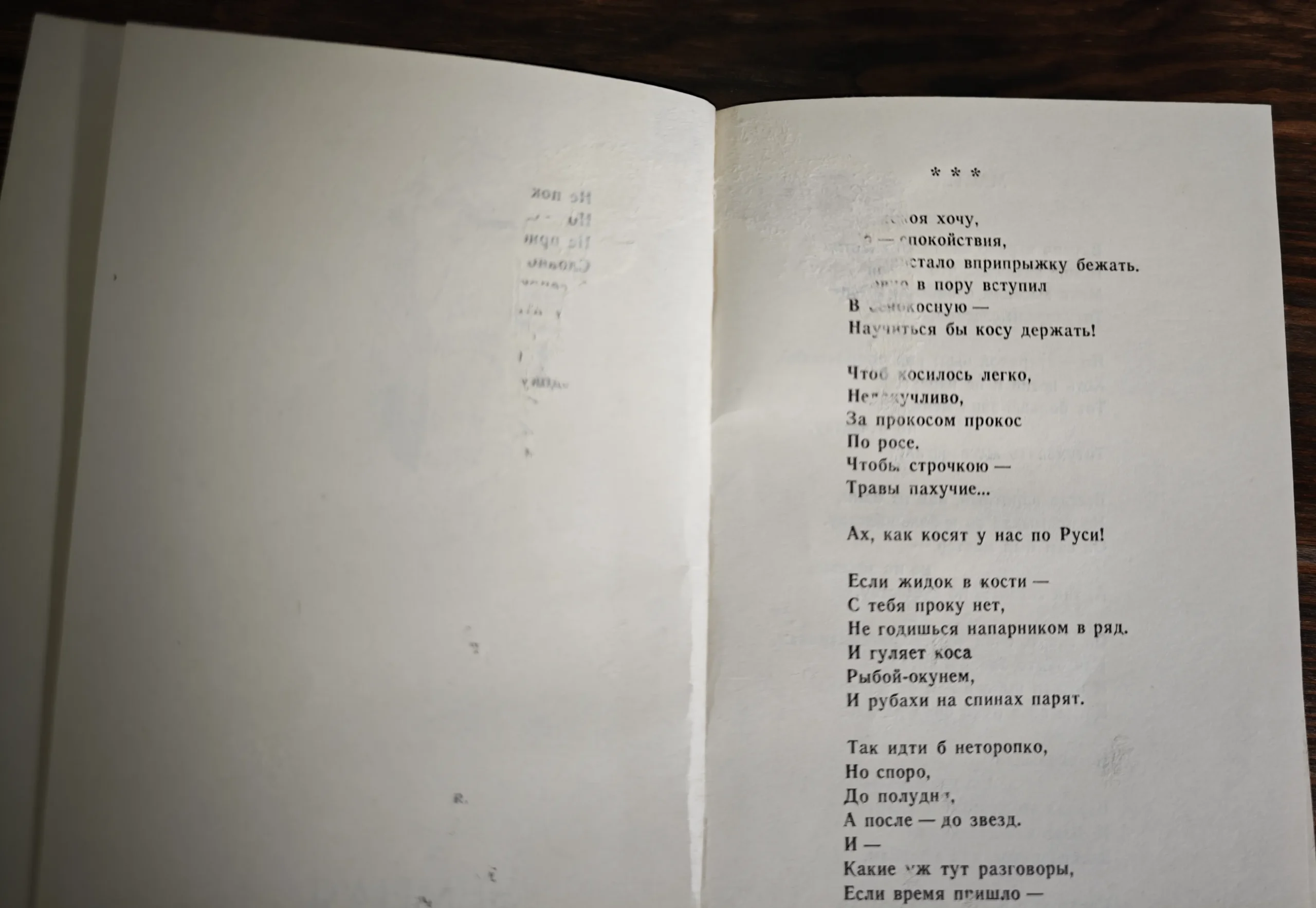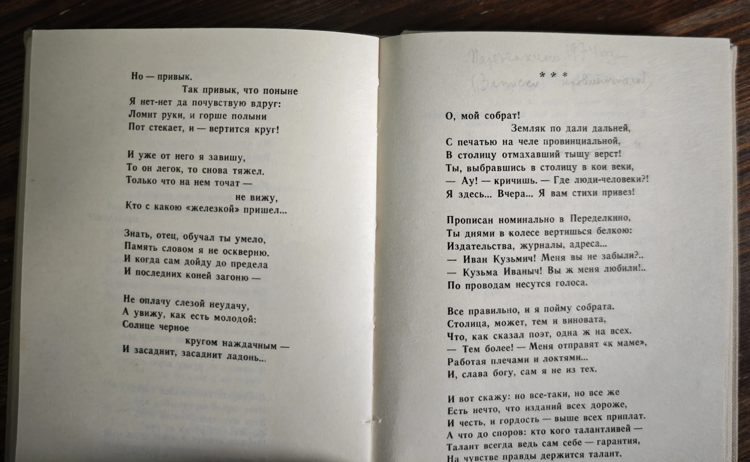 "Было все, как по заказу…"   "Оркестр замолк, угасли речи…"   "Прошу: не верьте болтовне…"   "Стих мой, бойся укора острого…"   "Шапочным вышло знакомство…"   "Мой критик, мой родной…"   "Вьется дорога шнурком от ботинка…"   "Нас вверх по Зее уносил проворно…"   "Что же ты разгрустился позорно…"   "Расположившись дружеским кругом…"   "Словно бы по отсчету кукушки…"   "Гудел агрегат под нагрузкой…"   "Вот где вернуться мне нынче дано…" Сторона дорогая моя...